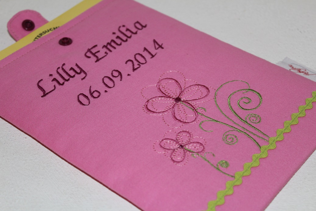 Ein sehr persönliches Geschenk ist diese individuell mit Namen und Geburtstag bestickte Schutzhülle für das gelbe Untersuchungsheft (U-Heft). Genäht aus Baumwollstoff mit Innenfutter und zusätzlichem Volumenvlies für mehr Stabilität, zu schließen mit einem Druckknopf. Das U-Heft wird einfach von oben eingeschoben.