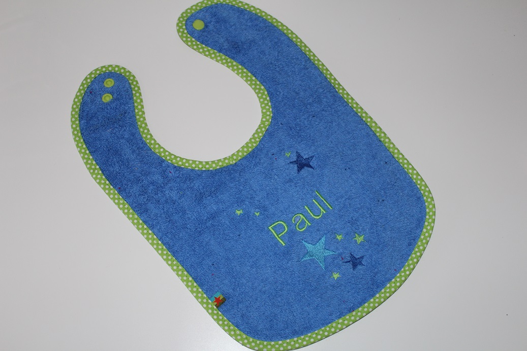 Auf dieses Lätzchen zum Wenden kann bei "Baby´s erster Mahlzeit" nicht verzichtet werden. Genäht aus flauschigem Frotteestoff, vorgewaschen bei 40°C, sorgfältig mit Baumwollschrägband eingefasst, individuell mit Name und Motiv bestickt und mit Kunsstoffdruckknopf zu schließen. Die Rückseite ist mit einem Nässeschutz (beschichtete Baumwolle) gefertigt. Somit bleibt das Shirt darunter immer trocken.